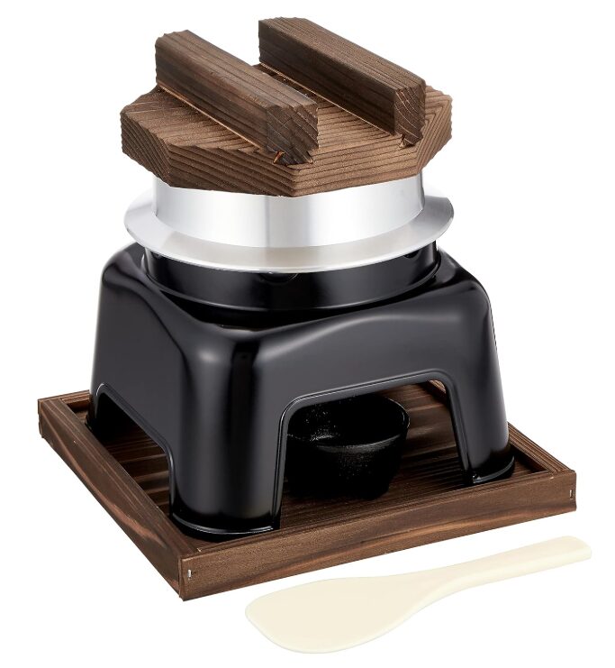 本製品はアルミ製の一合炊き釜に、台座と固形燃料用受け皿がセットになった釜めし調理セットです。