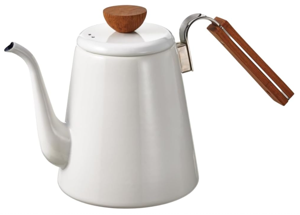狙った位置に静かにお湯を落とせる細い注ぎ口、IH・直火対応のホーロー素材、そしてウッドパーツの温かみあるデザイン。