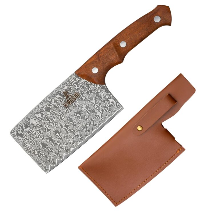 ダマスカス鋼の美しい波紋と、軽くて扱いやすいサイズ感が特徴のミニ中華包丁です。