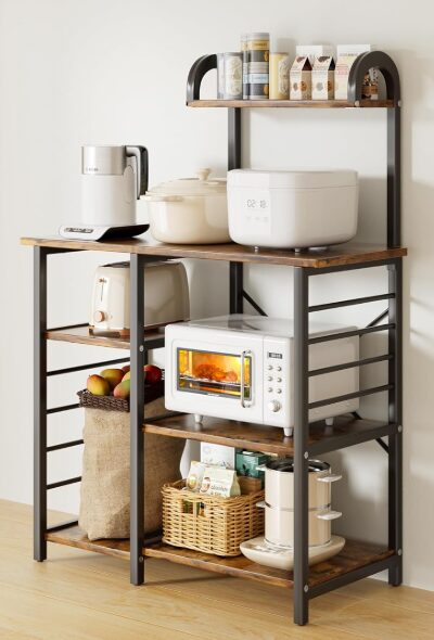 - 5段の広い棚があり、電子レンジや炊飯器、調味料などをすっきり収納可能。