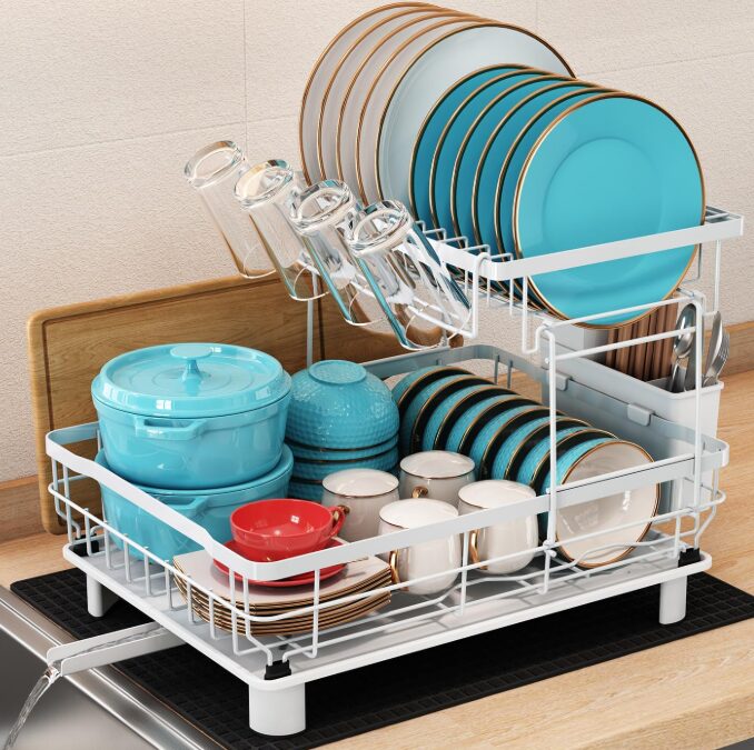 シンク上に設置する2段式水切りラックで、スペースを有効活用し、キッチンをスッキリと片付けることができます。