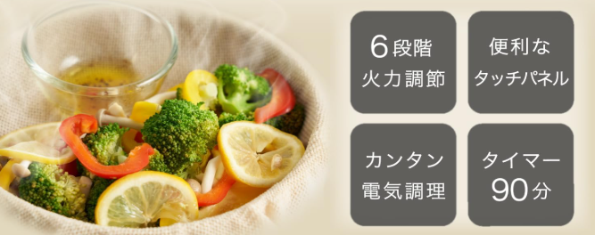 ボタンを押すだけで火力を6段階に調整でき、タイマーは1〜90分を1分単位で設定できます。