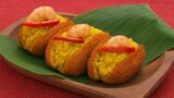 - くり抜いた食パンにカレーを詰め、パクチーをトッピングします。