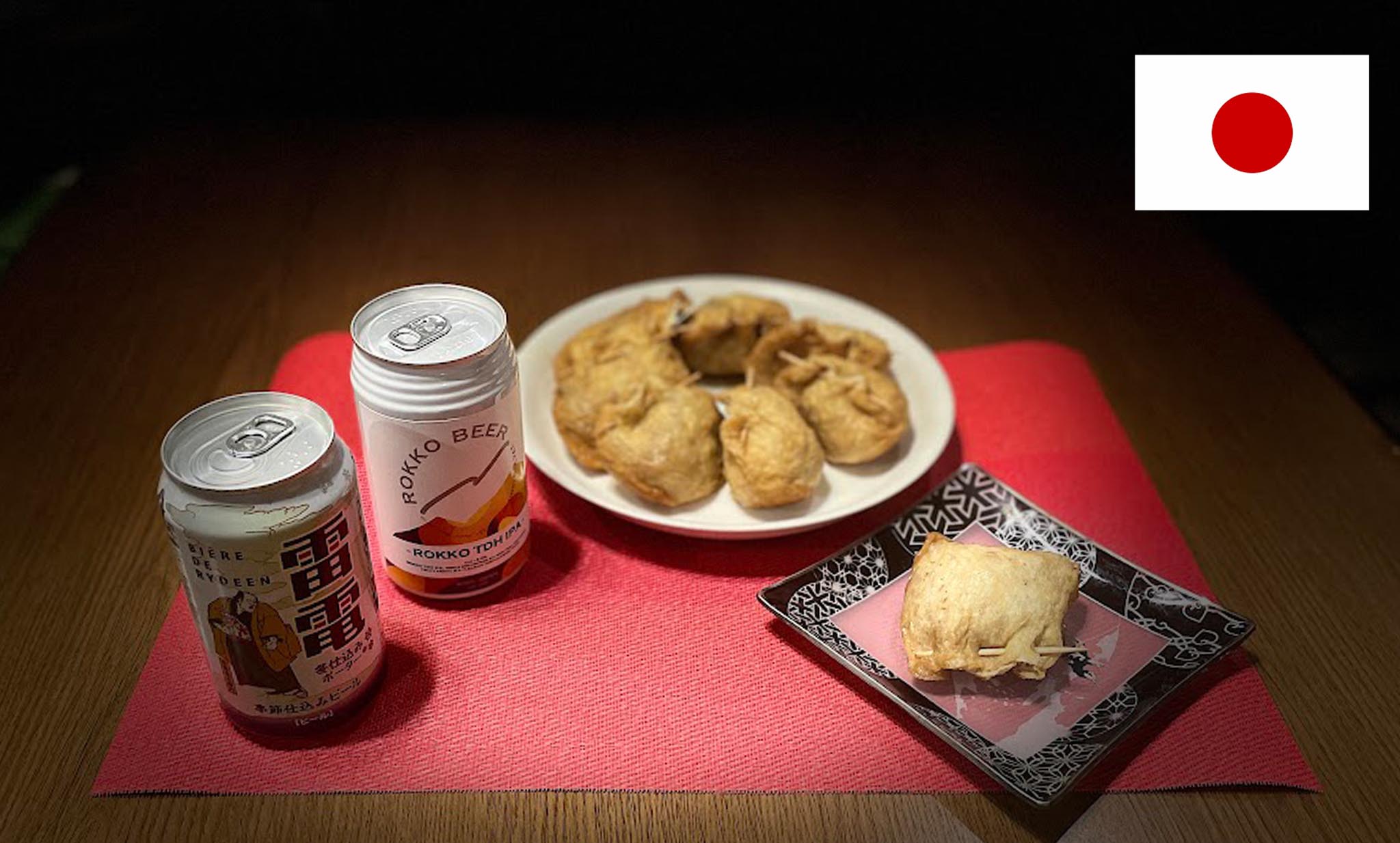 ②油揚げは熱湯をかけてから半分に切り、ひらいて袋状にする