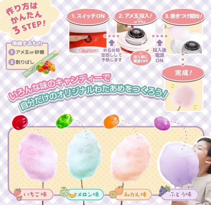 本製品の大きな魅力は、市販の飴玉を使って味付きわたあめを作れる点です。